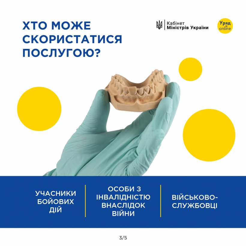 Держава запустила пілотний проєкт з безоплатного зубопротезування та лікування для учасників бойових дій, осіб з інвалідністю внаслідок війни та військовослужбовців.